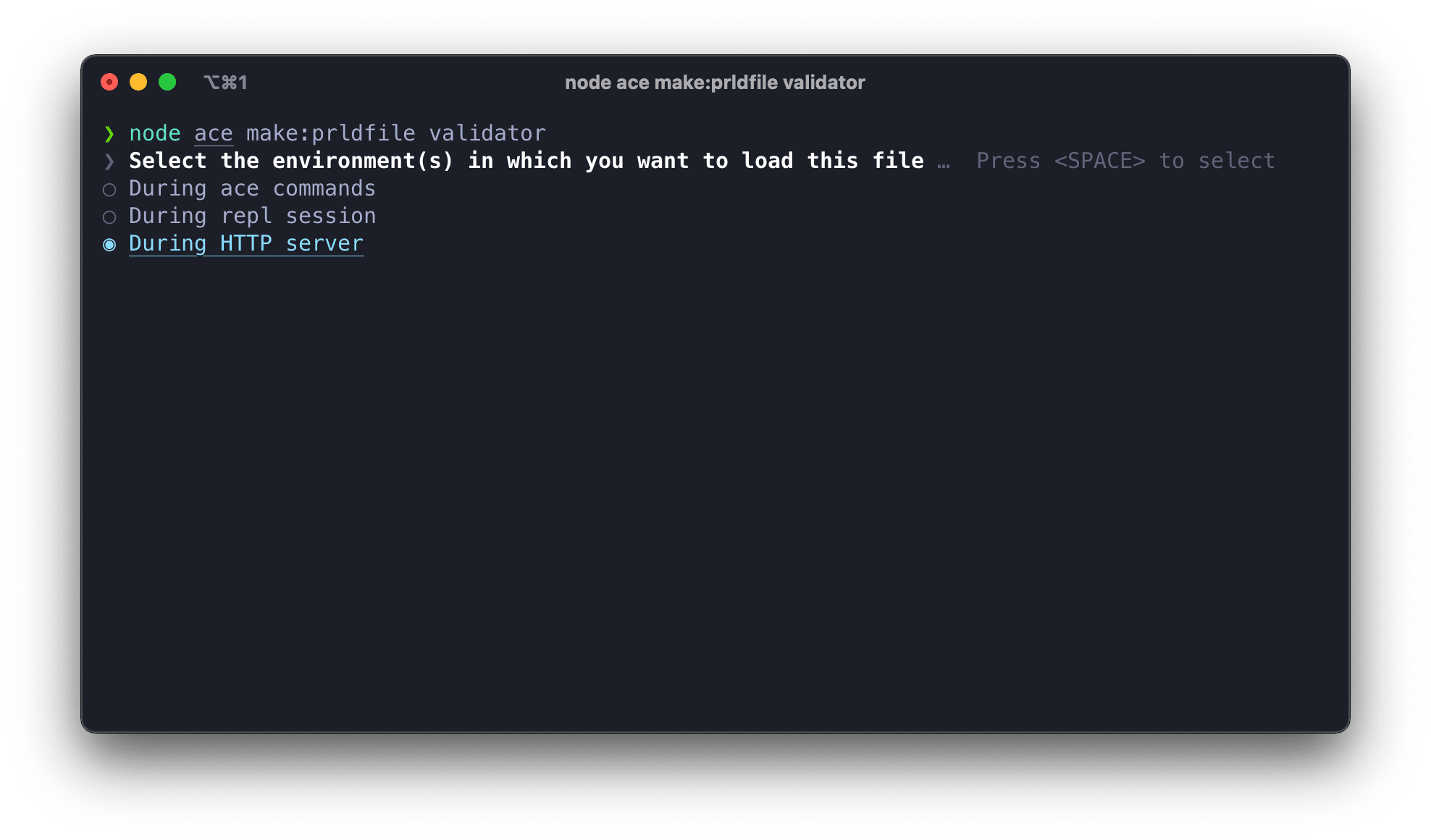 Ao longo deste guia, nós as manteremos dentro do arquivo start/validator.ts. Você pode criar este arquivo executando o seguinte comando Ace e selecionando o ambiente como "Durante o servidor HTTP".