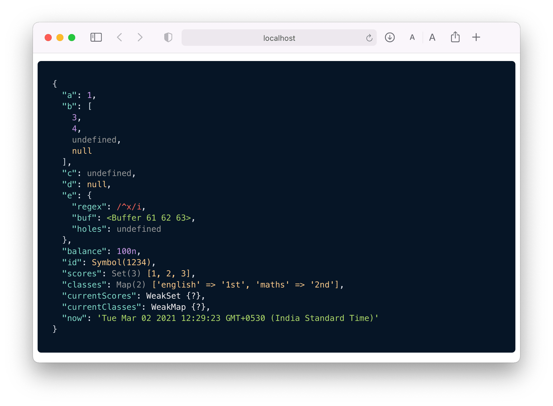 O auxiliar inspect imprime o valor na mesma saída. Você pode pensar neste método como o util.inspect do Node.js, mas em vez disso ele emite HTML em vez de escrever a saída no console.