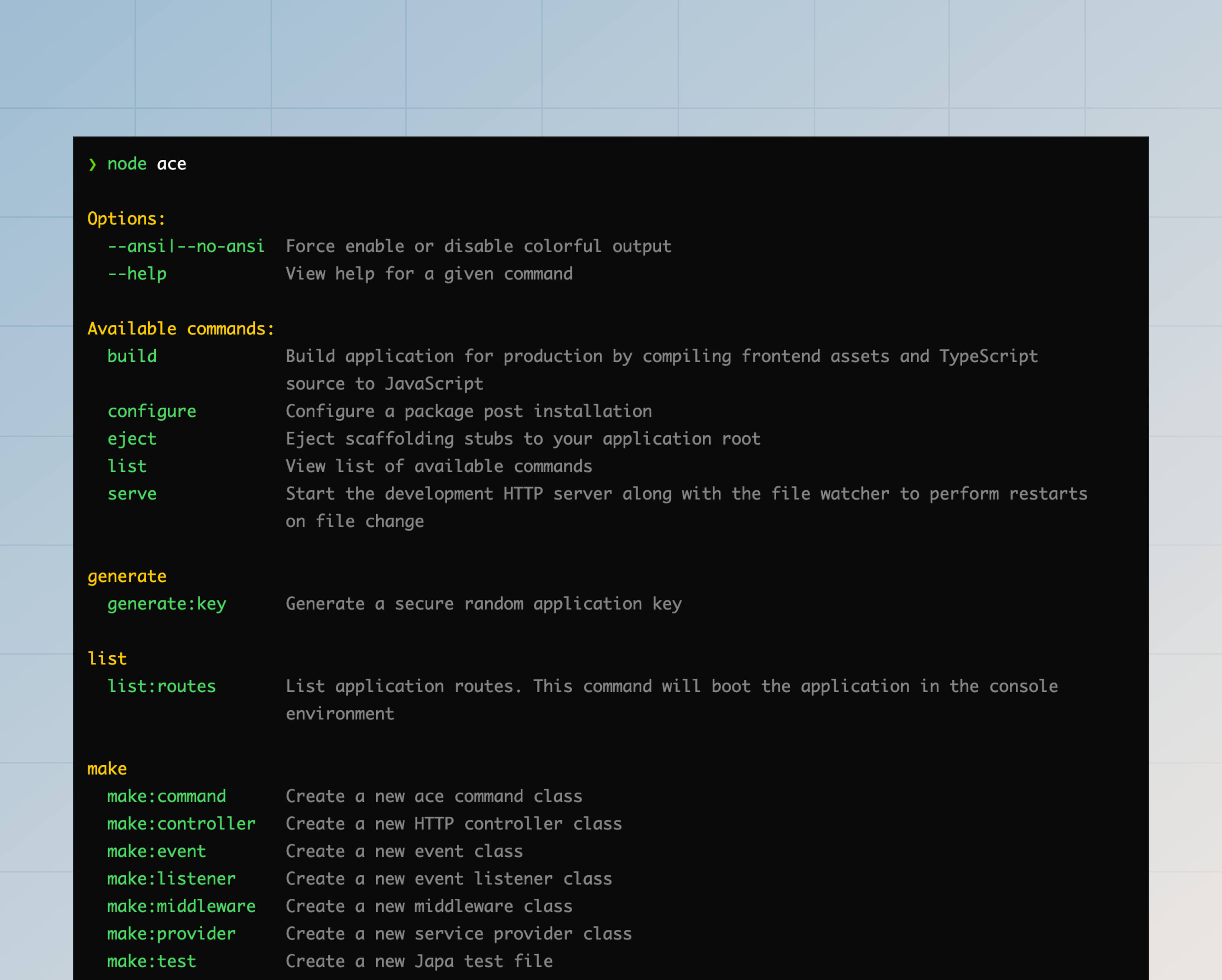 node ace list --no-ansi