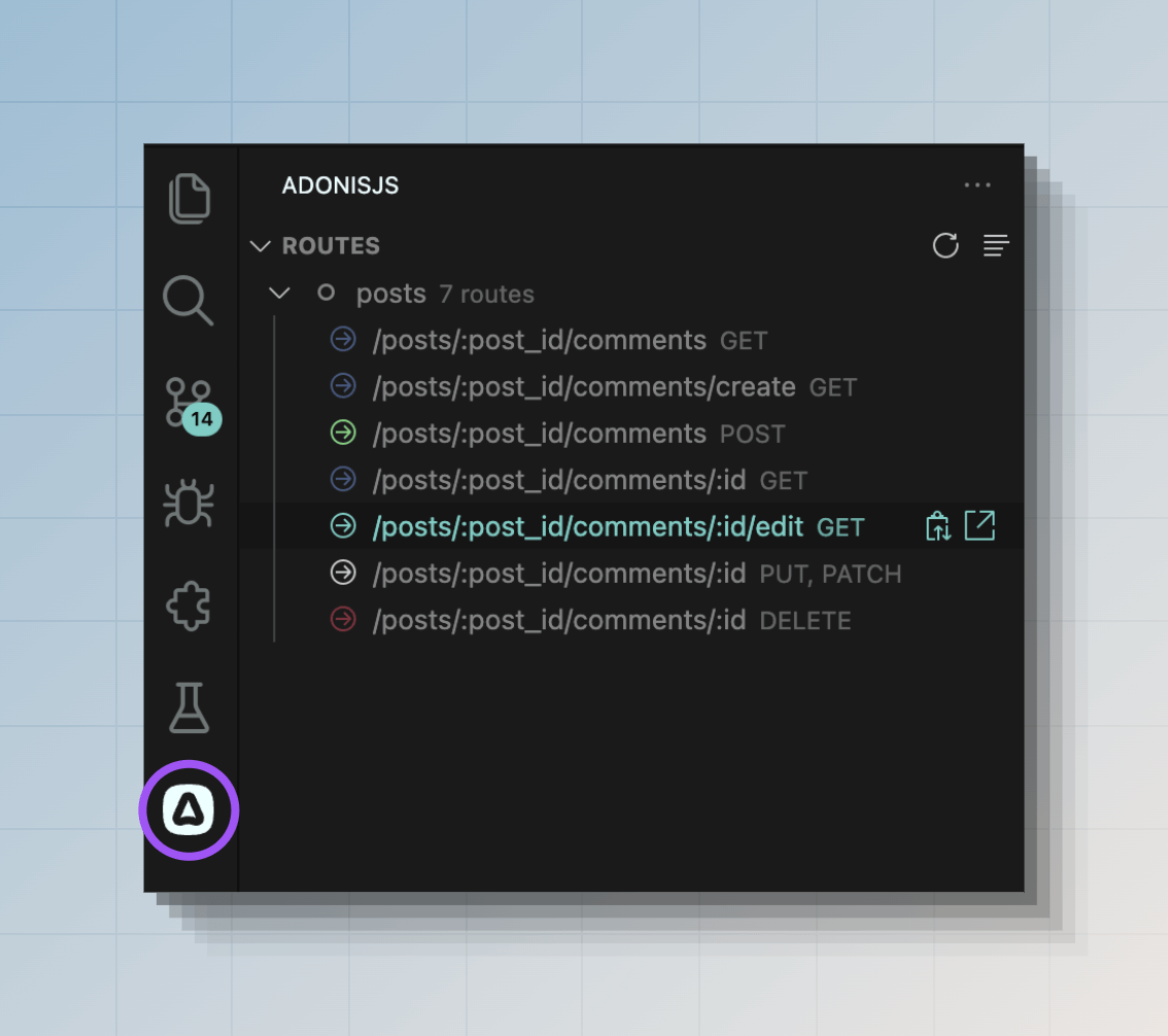node ace list:routesAlém disso, você pode ver a lista de rotas na barra de atividades do VSCode, se estiver usando nossa extensão oficial do VSCode.