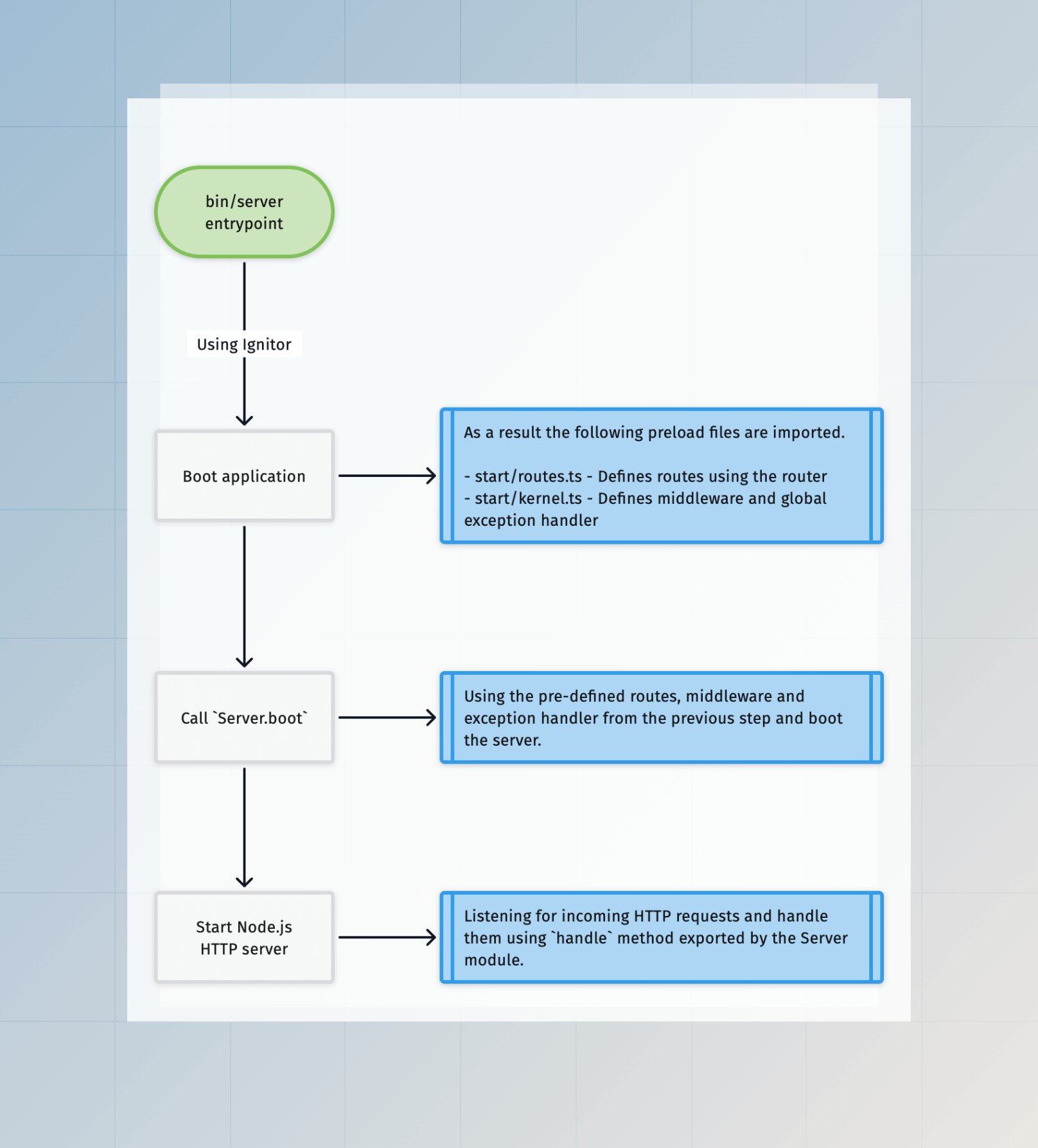 O servidor HTTP é inicializado quando você chama o método boot na classe Server. Por baixo dos panos, esse método executa as seguintes ações.